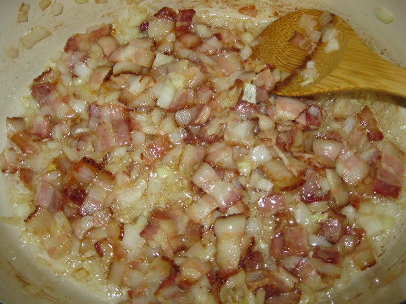 Put a 3.5 quart pot (or similar size) over medium/low heat and put just a bit of canola oil in the bottom of the pan. Add the bacon to the pot. Cook, stirring occassionally, until the bacon just starts to brown (it will cook more as you add the rest of the ingredients).